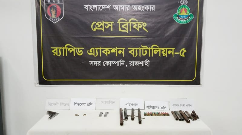 রাজশাহী ব্যুরো: রাজশাহীতে পরিত্যক্ত অবস্থায় আগ্নেয়াস্ত্র উদ্ধার করেছে র্যাব। গতকাল শনিবার গভীর রাতে র্যাব-৫-এর রাজশাহী সদর কোম্পানির একটি দল জেলার তানোর উপজেলার চুনিয়াপাড়া এলাকায় এই অভিযান চালায়। অভিযানে একটি বিদেশি পিস্তল, দুটি খালি ম্যাগাজিন, পাঁচ রাউন্ড পিস্তলের গুলি, ১২টি শটগানের গুলি, চারটি পাইপগান, ছয়টি চিকন পাইপসহ অস্ত্র তৈরির যন্ত্রাংশ উদ্ধার করা হয়।