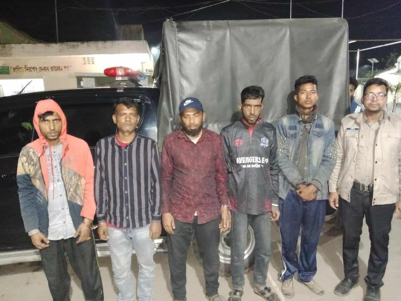 গ্রেফতারকৃতরা হলেন, মোঃ রাজু আহম্মদ (৩৫), মোঃ মোহন বাবু (৪০), মোঃ মাসুদ রানা উজ্জল (৩৫), মোঃ আমিনুল ইসলাম আমু (৩৫) ও মোঃ জাকারিয়া ইসলাম (১৯)।