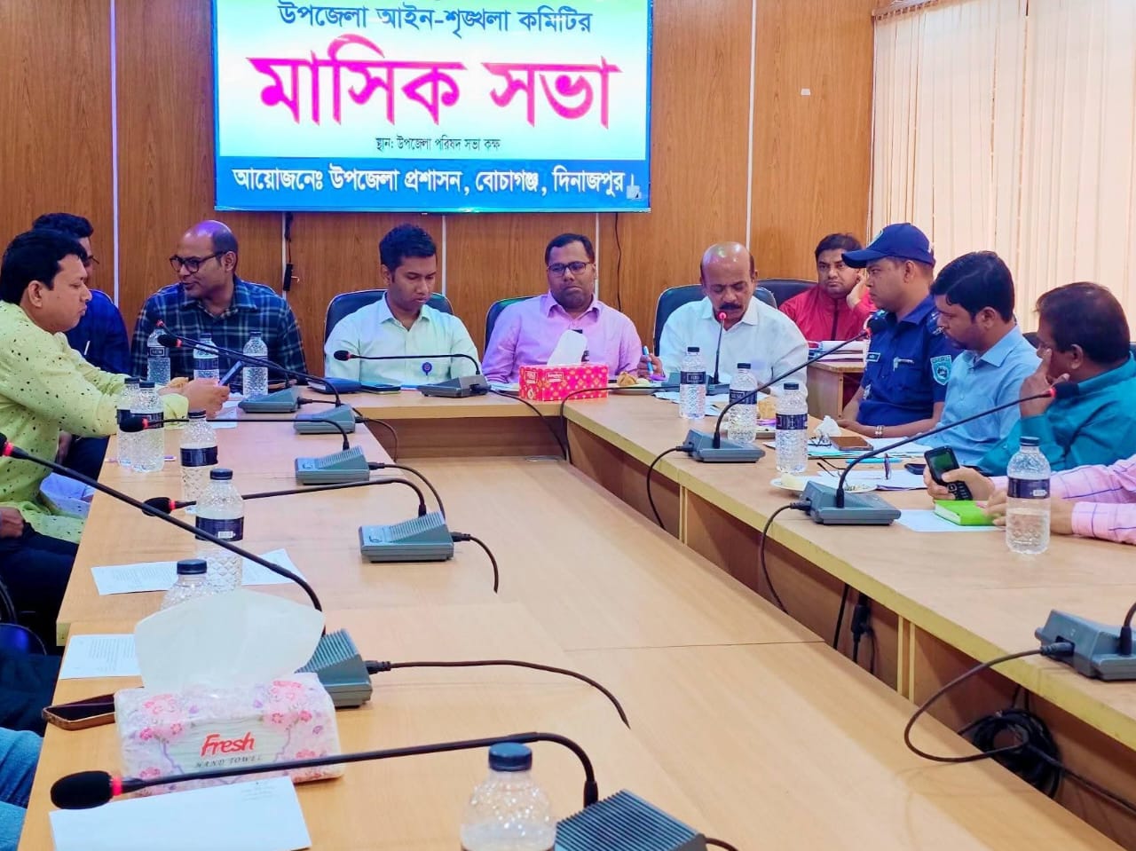 দিনাজপুরের বোচাগঞ্জ উপজেলায় উপজেলা আইন-শৃঙ্খলা কমিটির মাসিক সভা অনুষ্ঠিত হয়েছে। সভায় উপজেলার সার্বিক আইন-শৃঙ্খলা পরিস্থিতি, জননিরাপত্তা, জ্বালানি তেলের সরবরাহসহ বিভিন্ন গুরুত্বপূর্ণ বিষয় নিয়ে বিস্তারিত আলোচনা করা হয়।