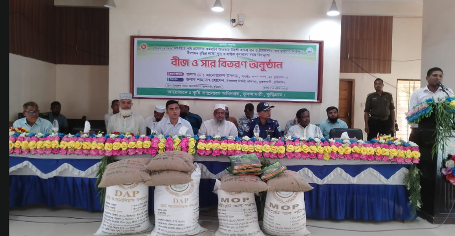 ভূরুঙ্গামারী (কুড়িগ্রাম) প্রতিনিধিঃ গোলাম মোস্তফা:কুড়িগ্রামের ভূরুঙ্গামারীতে উপজেলা কৃষি সম্প্রসারণ অধিদপ্তরের উদ্যোগে ক্ষুদ্র ও প্রান্তিক কৃষকদের মাঝে বিনামূল্যে বীজ ও সার বিতরণ কার্যক্রমের উদ্বোধন করা হয়েছে।সোমবার (১৩ এপ্রিল) দুপুরে উপজেলা পরিষদ হলরুমে ২০২৫-২০২৬ অর্থবছরের কৃষি প্রণোদনা কর্মসূচির আওতায় উফশী আউশ ধান ও গ্রীষ্মকালীন তিল ফসলের আবাদ ও উৎপাদন বৃদ্ধির লক্ষ্যে এই কর্মসূচির উদ্বোধন করেন কুড়িগ্রাম-১ আসনের সংসদ সদস্য আনোয়ারুল ইসলাম।উপজেলা নির্বাহী অফিসার শাহাদাৎ হোসেনের সভাপতিত্বে অনুষ্ঠানে প্রধান অতিথি হিসেবে উপস্থিত ছিলেন এমপি আনোয়ারুল ইসলাম। স্বাগত বক্তব্য দেন উপজেলা কৃষি অফিসার কৃষিবিদ আব্দুল জব্বার।এসময় উপস্থিত ছিলেন ভূরুঙ্গামারী থানার অফিসার ইনচার্জ (ওসি) আজিম উদ্দিন, উপজেলা বিএনপির আহ্বায়ক কাজি আলাউদ্দিন মন্ডল, উপজেলা জামায়াতের আমির আলহাজ আনোয়ার হোসেন, সহকারী সেক্রেটারি মিজানুর রহমানসহ কৃষি বিভাগের কর্মকর্তাবৃন্দ।উপজেলা কৃষি অফিসার আব্দুল জব্বার জানান, চলতি মৌসুমে উপজেলার ১০টি ইউনিয়নের ৫০০ জন কৃষকের মাঝে কৃষি প্রণোদনার আওতায় বিনামূল্যে ৫ কেজি আউশ ধান বীজ, ১০ কেজি ডিএপি সার, ১০ কেজি এমওপি সার বিতরণ করা হবে। এছাড়া ৫০ জন কৃষককে ১ কেজি করে তিল বীজ দেওয়া হবে।প্রধান অতিথির বক্তব্যে এমপি আনোয়ারুল ইসলাম বলেন, “কৃষক আমাদের প্রাণ। তাদের পরিশ্রমেই দেশের গ্রামীণ অর্থনীতি সচল থাকে।” তিনি কৃষি বিভাগের তদারকি বৃদ্ধি এবং কৃষকদের উন্নয়নে আরও কার্যকর কর্মসূচি গ্রহণের আহ্বান জানান। তিনি আরও বলেন, সকলের সম্মিলিত প্রচেষ্টায় কৃষি খাতকে সমৃদ্ধ করে তুলতে হবে।